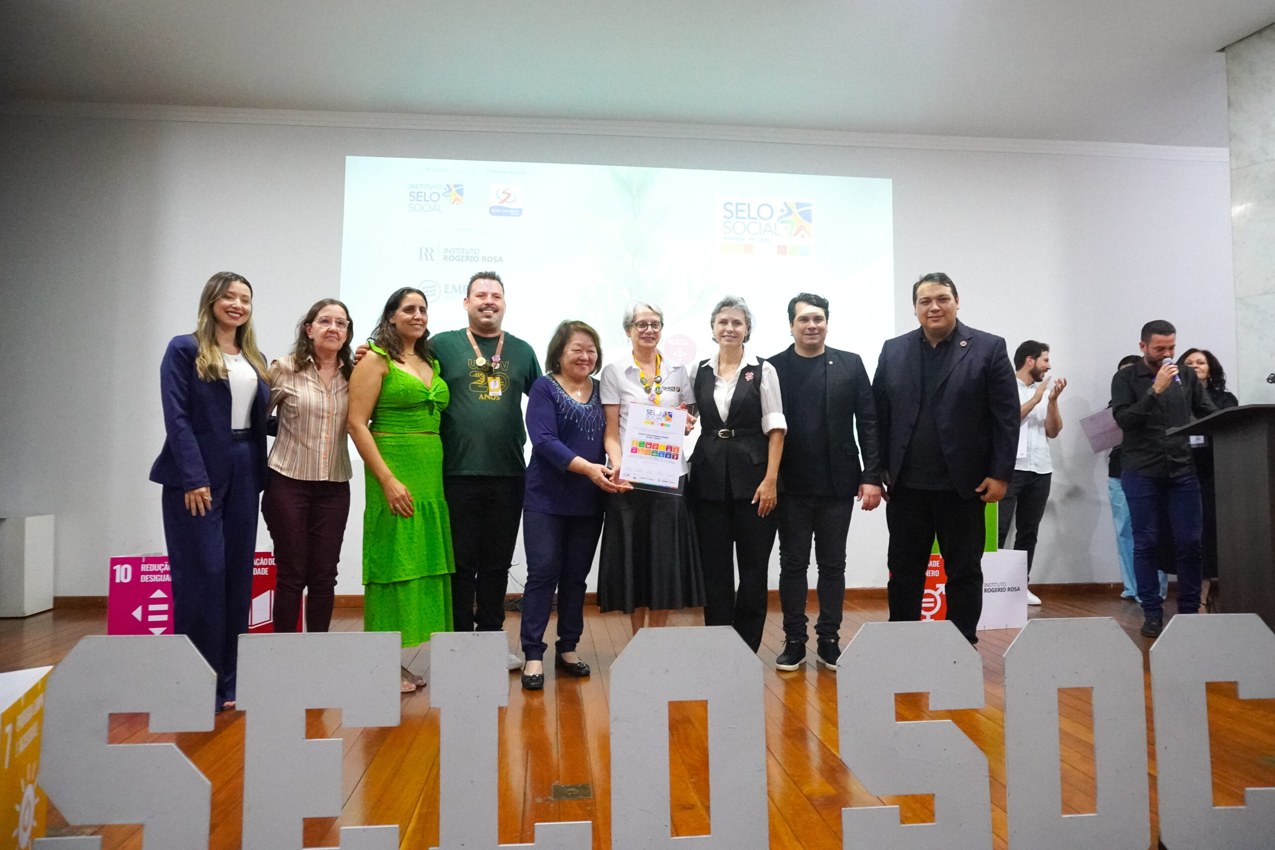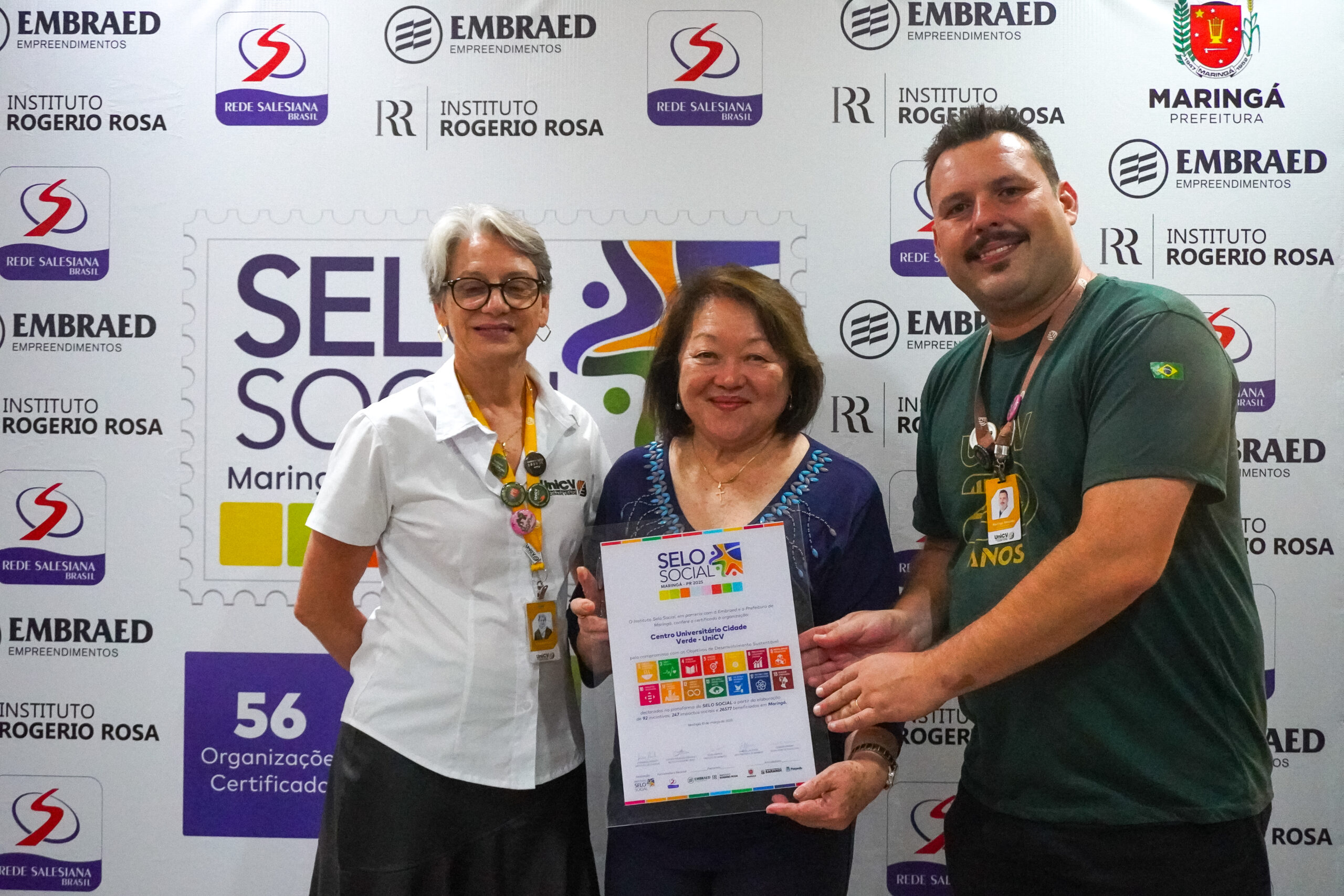 Pelo quarto ano consecutivo, o Centro Universitário Cidade Verde (UniCV) recebeu o Selo Social Maringá com recorde de projetos certificados. É uma das instituições de ensino com o maior número, são 92 iniciativas que vem beneficiando mais de 200 mil pessoas em todo o país. O certificado foi entregue nesta terça-feira (dia 10), no auditório Hélio Moreira, na prefeitura de Maringá.